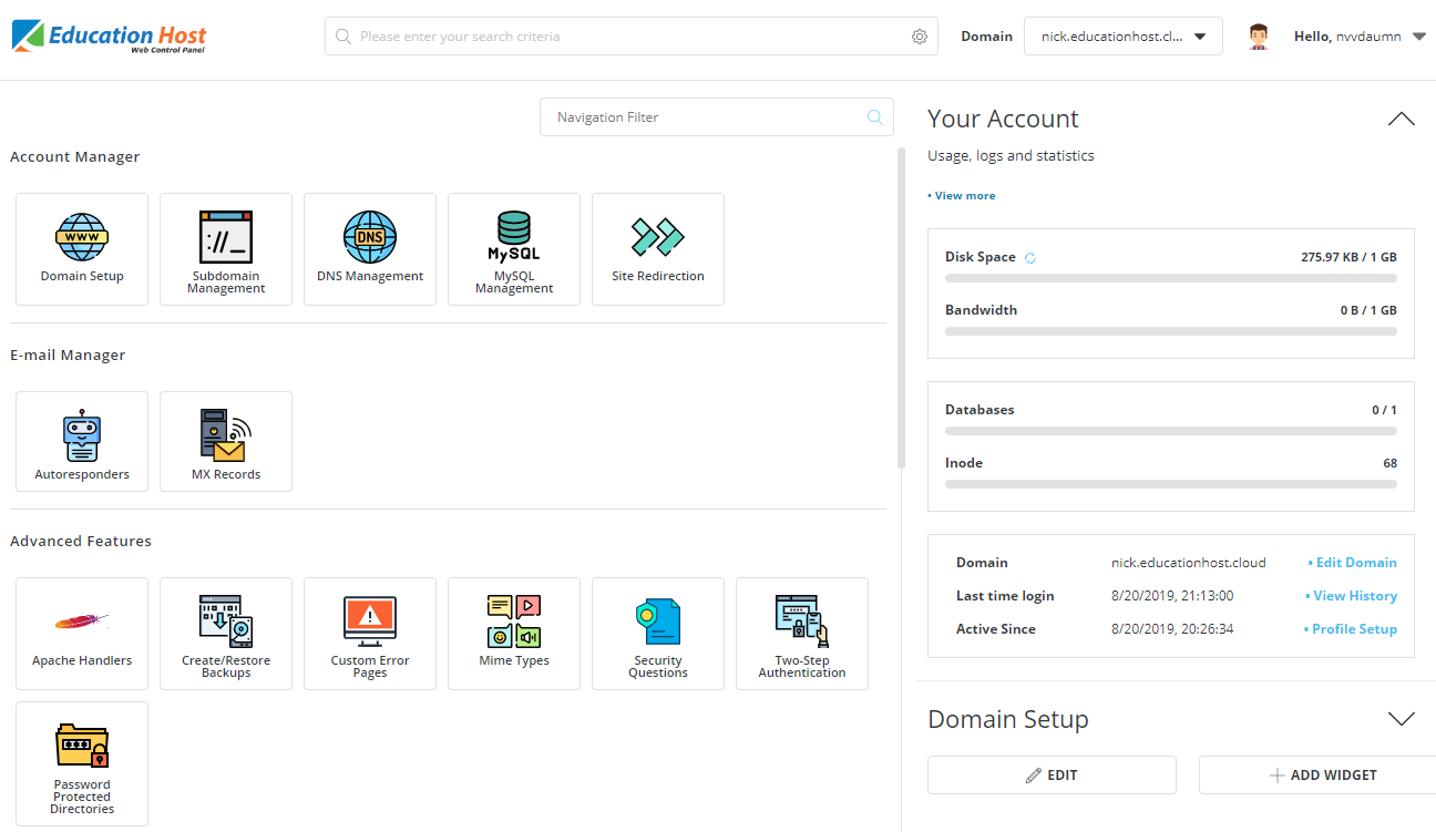 Manage your packages, support tickets and upgrades with the Client Area and your Web Hosting from within the DirectAdmin control panel:
